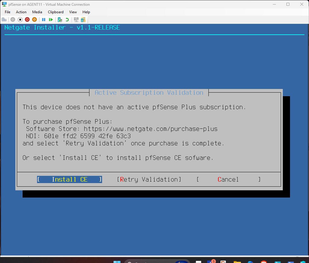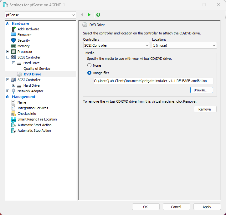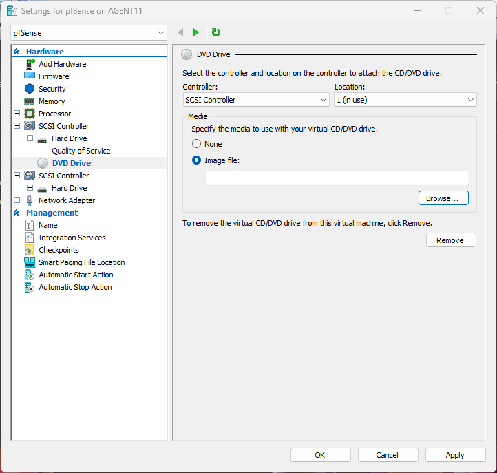 Configuration of the pfSense VM before installation.