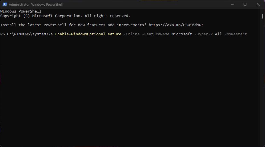Enable-WindowsOptionalFeature -Online -FeatureName Microsoft-Hyper-V-All