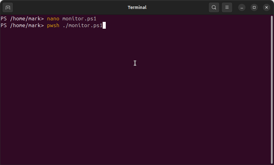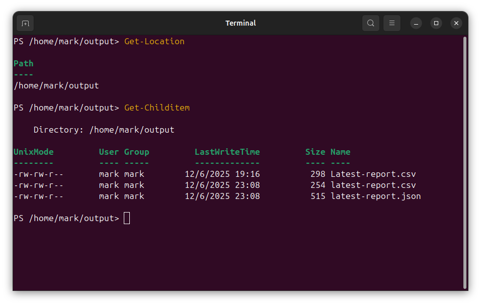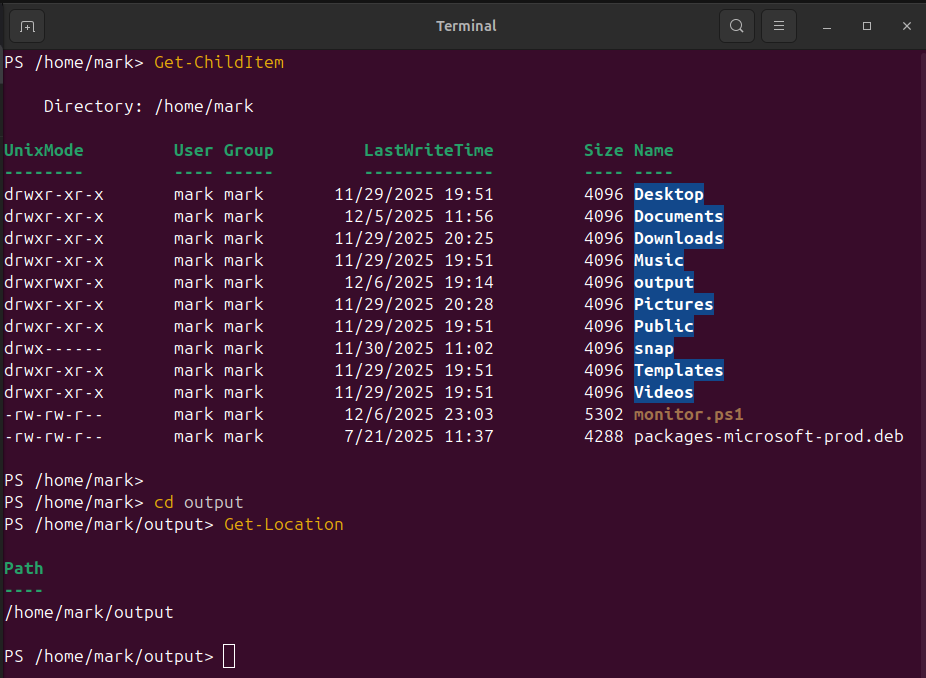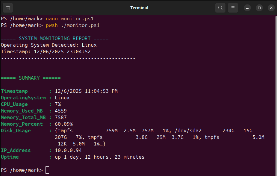 This section demonstrates how to run your cross-platform system monitoring script in PowerShell 7 on Ubuntu. You will see every step from invoking the script to verifying JSON/CSV output and reviewing stored reports.