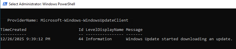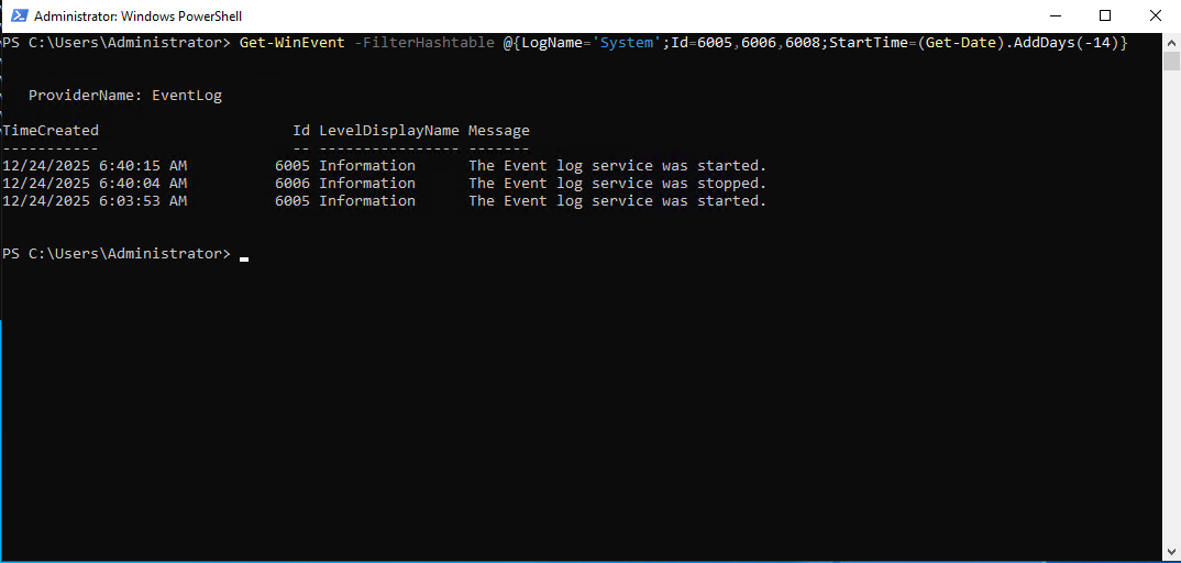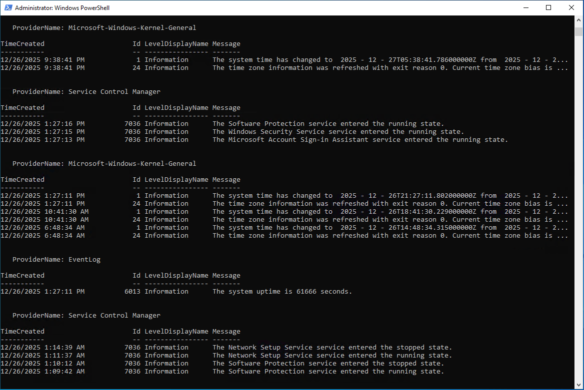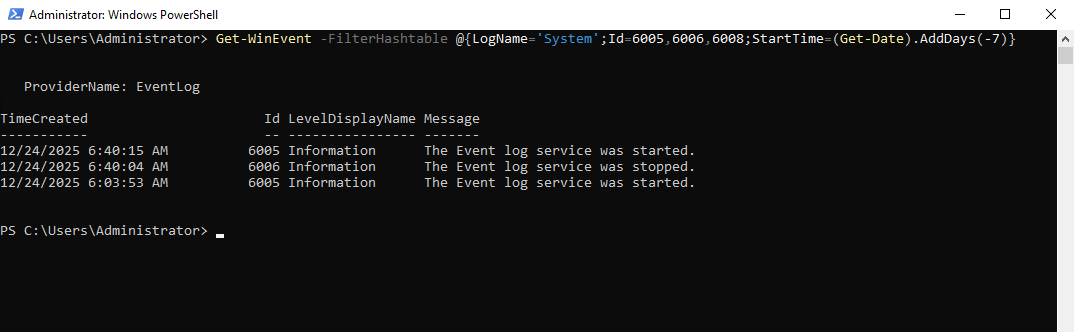This command queries the System event log for startup, shutdown, and unexpected shutdown events over the past 7 days. By correlating Event IDs 6005, 6006, and 6008, administrators can quickly reconstruct system reboot timelines and distinguish between clean shutdowns and abnormal terminations.