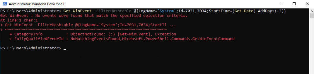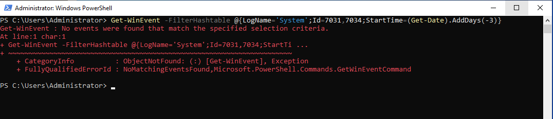 This command checks the System event log for recent service crashes (Event IDs 7032 and 7034) within the last three days. The absence of results indicates that no services terminated unexpectedly during this period, suggesting stable service operation.
