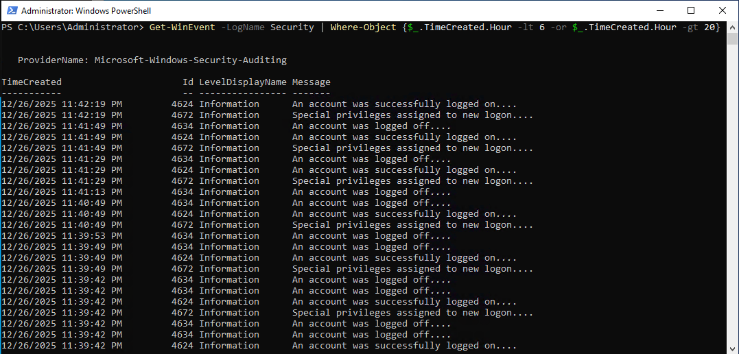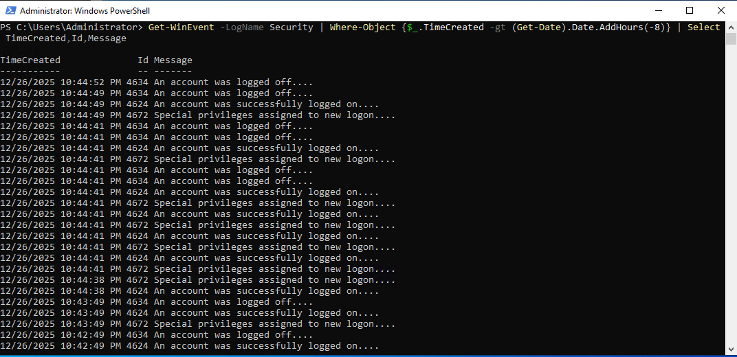 This command builds a chronological view of recent security activity by filtering Security event logs to the last eight hours. By displaying logon (4624), privilege assignment (4672), and logoff (4634) events together, it helps reconstruct user and system authentication activity and validate normal administrative behavior.