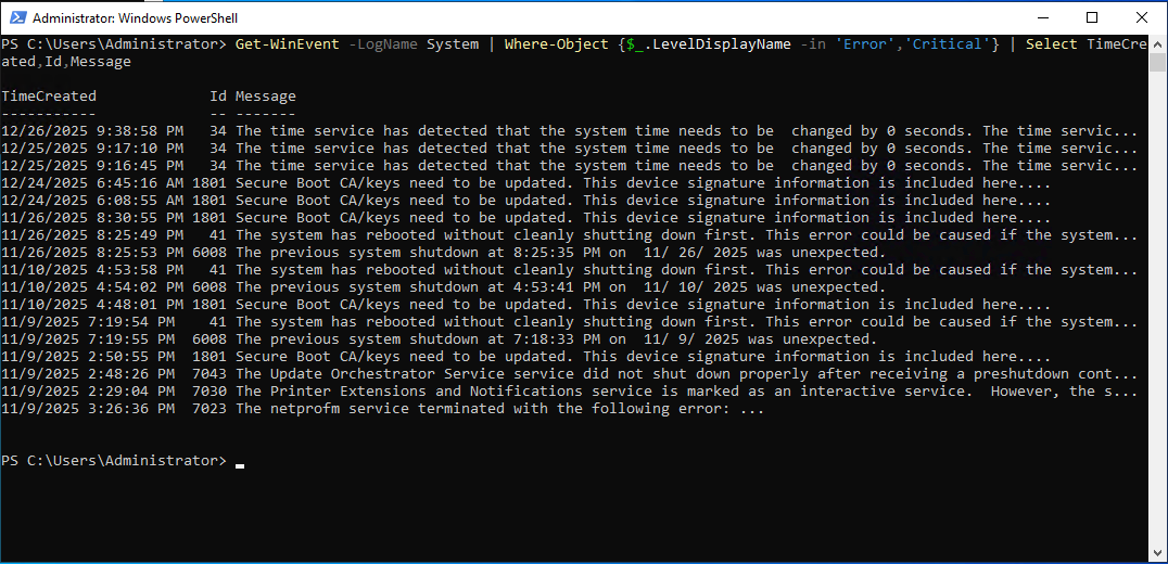 This query filters the System event log to surface only Error and Critical events, providing a focused view of serious operating system issues. It highlights unexpected shutdowns, reboot anomalies, service failures, time synchronization events, and firmware-related security messages. This type of analysis is useful for diagnosing system instability, identifying power or hardware issues, and validating system health during incident response or troubleshooting.