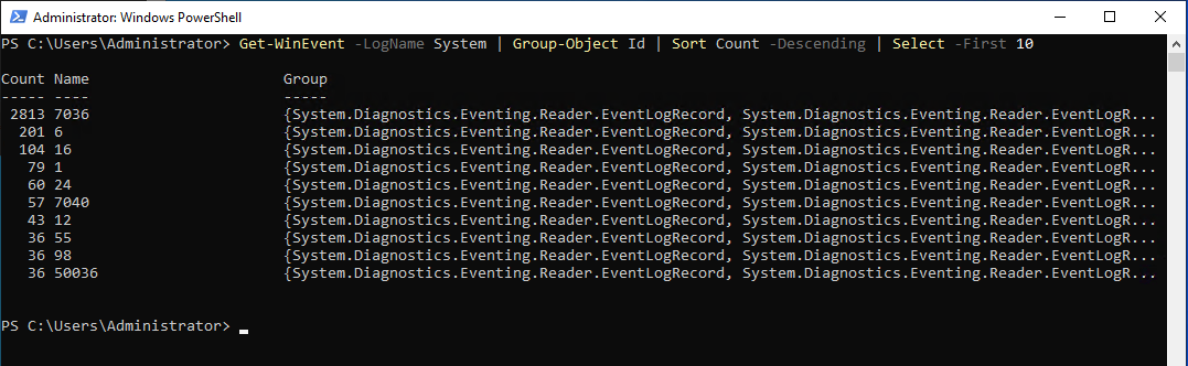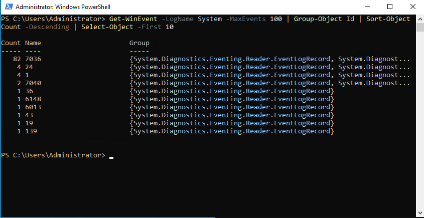 Get-WinEvent -LogName System -MaxEvents 100 | Group-Object Id | Sort-Object Count -Descending | Select-Object -First 10