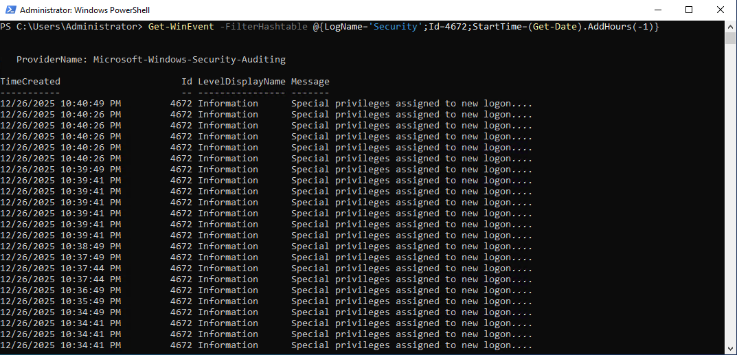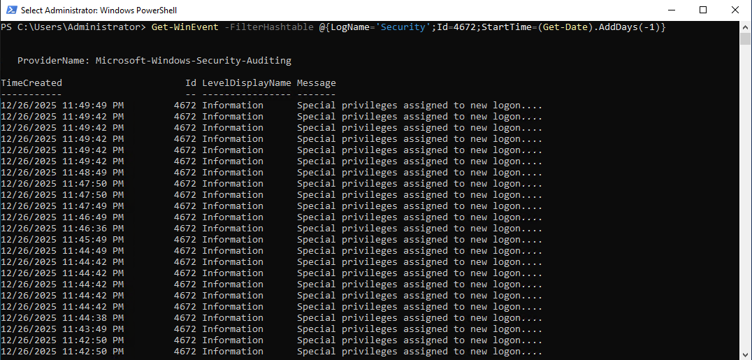 This command retrieves security events indicating when elevated privileges were assigned during a logon. Event ID 4672 is generated when an account logs in with administrative or special rights. Monitoring these events helps identify privileged access, validate administrative activity, and detect potential unauthorized elevation attempts.