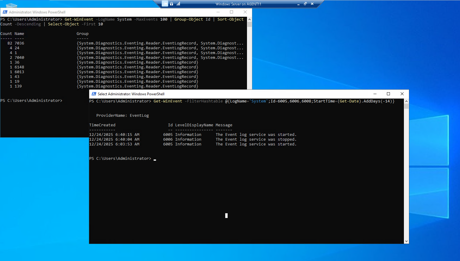 This lab demonstrates how to enumerate, query, filter, and export Windows Event Logs using PowerShell. A practice that can come in handy in scenarios where you're troubleshooting a server and GUI access is limited or unavailable, and you need to quickly evaluate something.