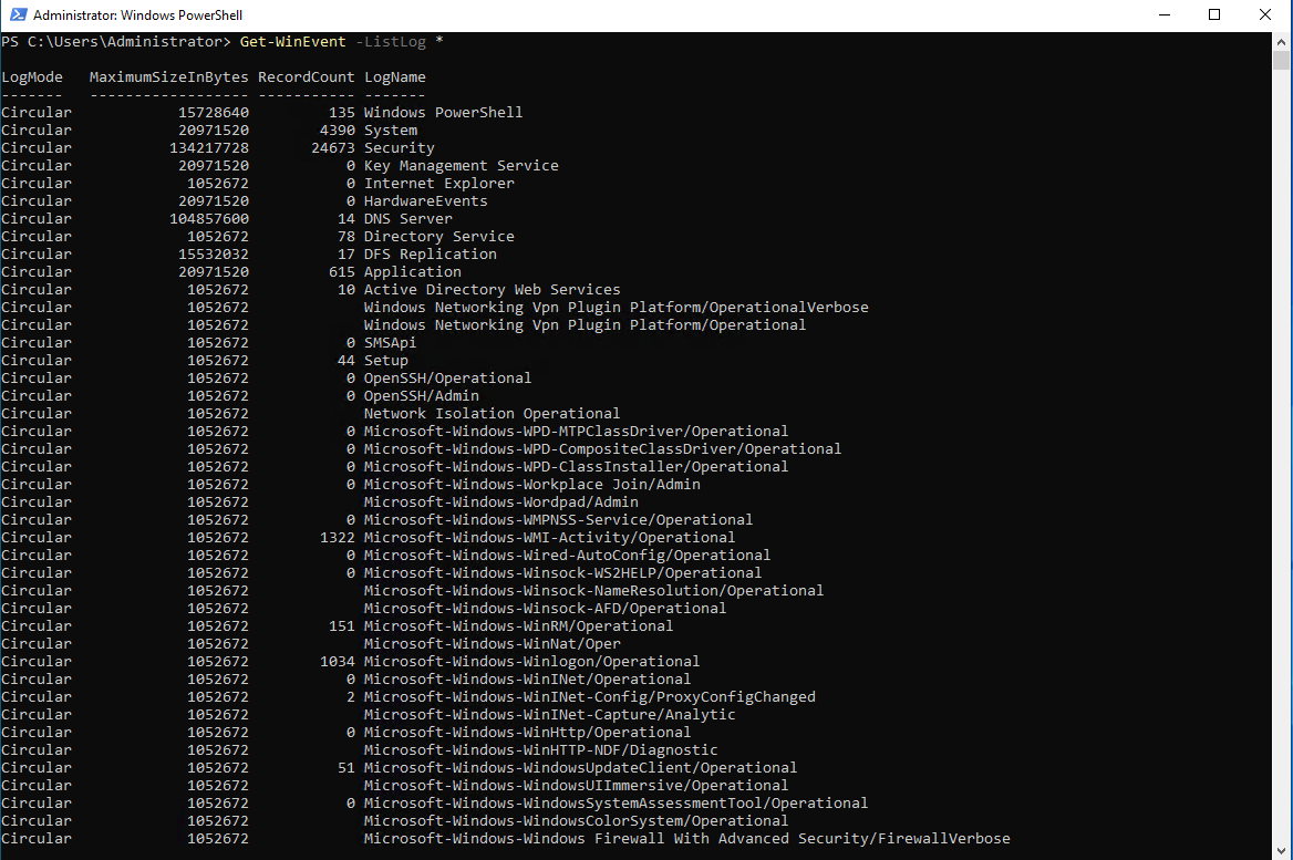This command enumerates every Windows Event Log available on the system, returning high-level metadata about each log rather than indivdual events.