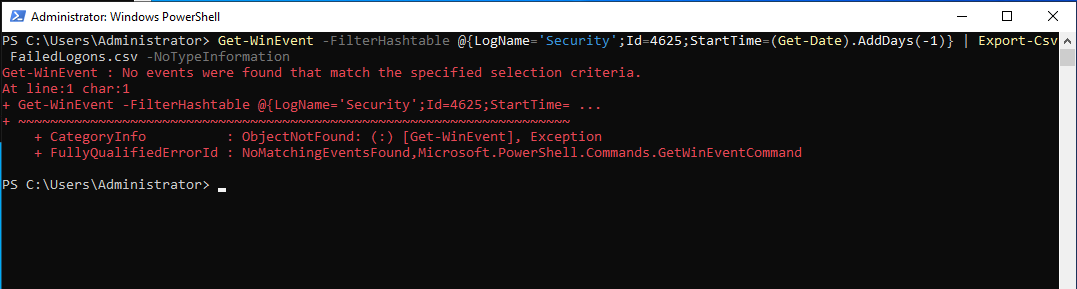 This command attempts to export failed authentication events (Event ID 4625) from the Security log over the last 24 hours into a CSV file for reporting or investigation. In this case, no events were found, indicating no failed logon attempts occurred during the selected timeframe. This confirms a healthy authentication state and demonstrates how PowerShell can be used to generate audit-ready evidence—even when no issues are present.