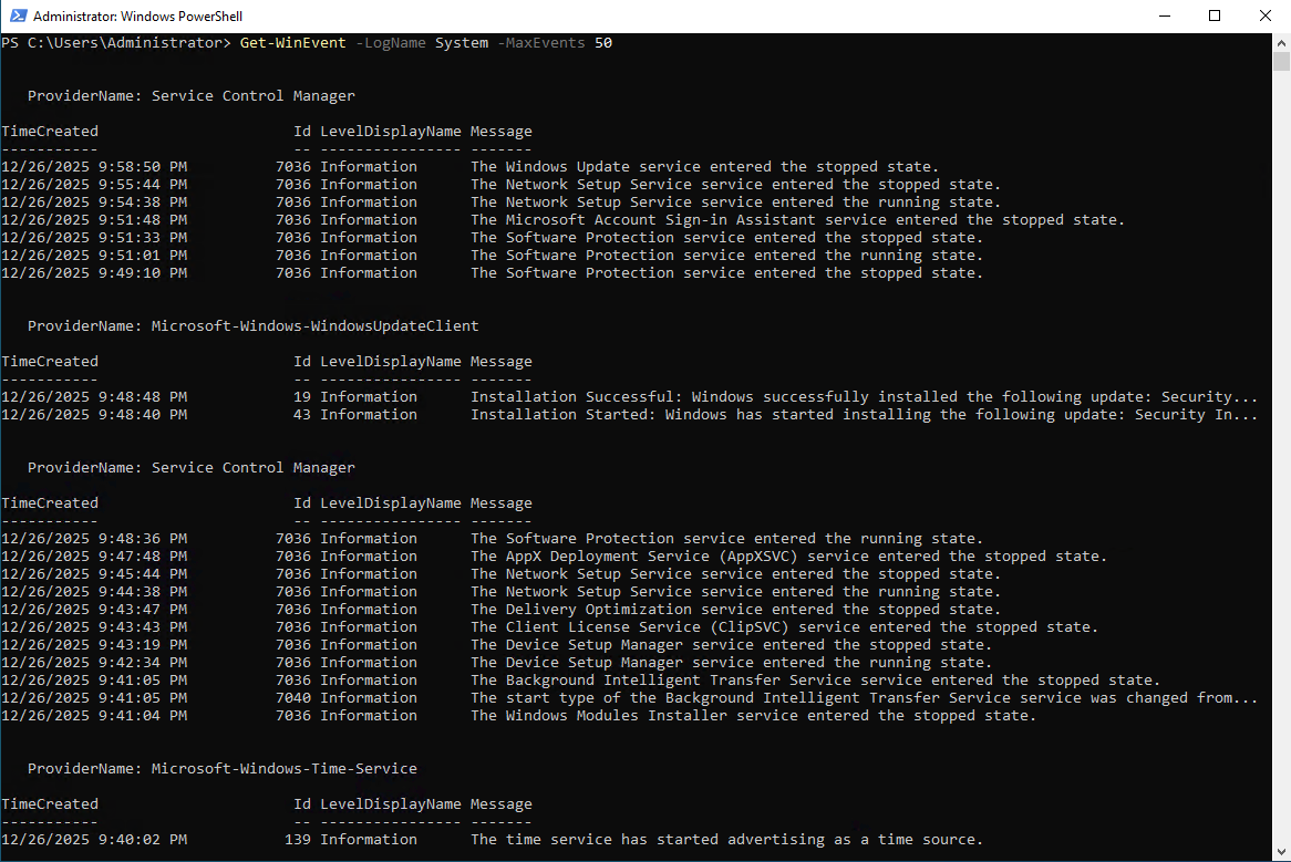 This command retrieves the 50 most recent events from the System event log, displaying them directly in the PowerShell console.