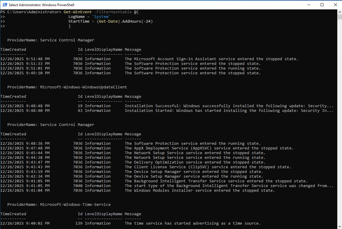This command retrieves only System log events that occurred within the last 24 hours, using PowerShell's native event filtering engine instead of post-processing results.