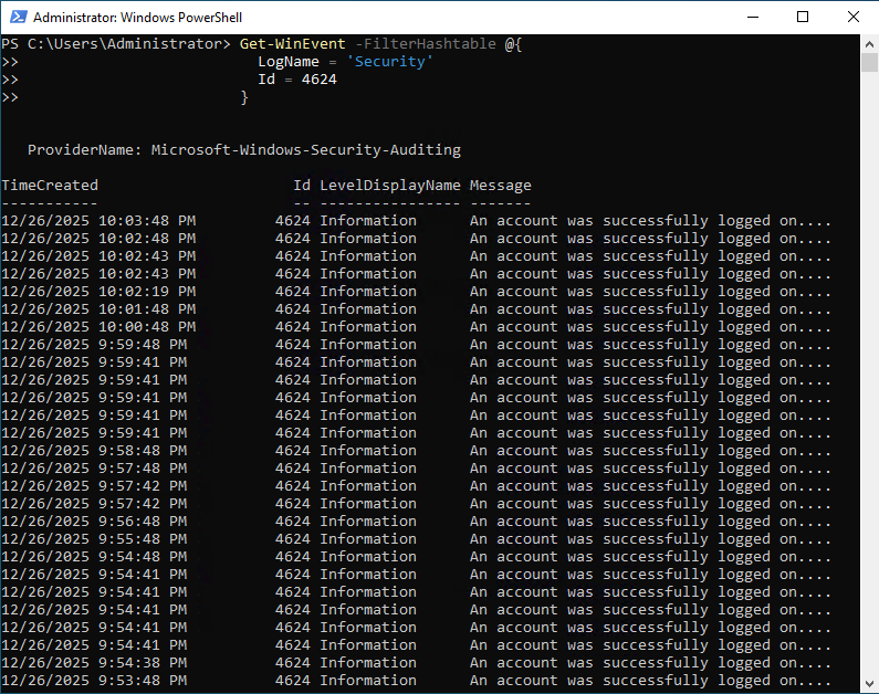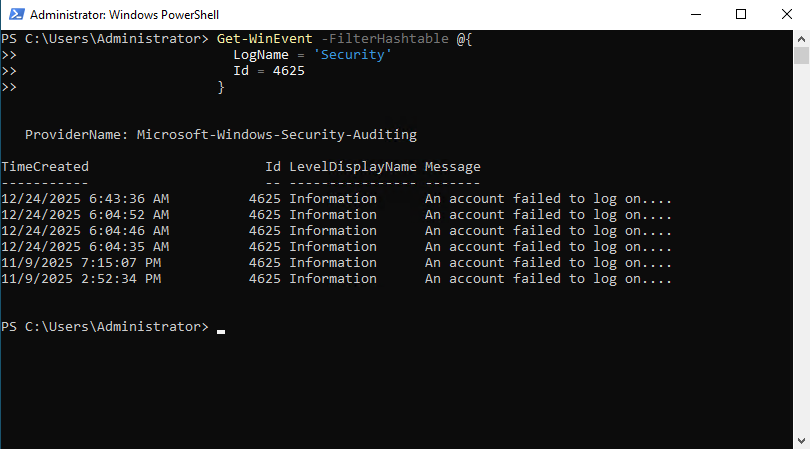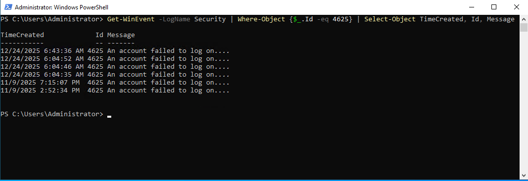 Get-WinEvent -LogName Security | Where-Object { $_.Id -eq 4625 } | Select-Object TimeCreated, Id, Message